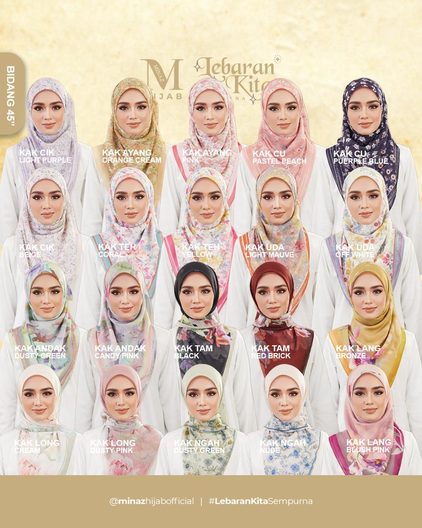Kak Cik Light Purple, Kak Ayang Orange Cream, Kak Ayang Pink, Kak Cu Pastel Peach, Kak Cu Purple Blue, Kak Cik Beige, Kak Teh Coral, Kak Teh Yellow, Kak Uda Light Mauve, Kak Uda Off White, Kak Andak Dusty Green, Kak Andak Candy Pink, Kak Tam Black, Kak Tam Red Brick, Kak Lang Bronze, Kak Long Cream, Kak Long Dusty Pink, Kak Ngah Dusty Green, Kak Ngah Nude, Kak Lang Blush Pink